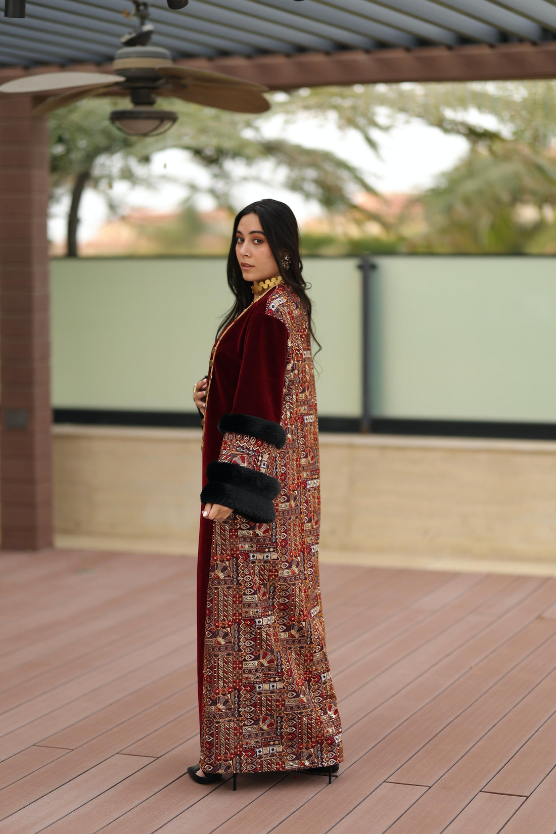 A luxurious velvet qoftan in rich burgundy tones, detailed with intricate mosaic-inspired patterns and elegant...