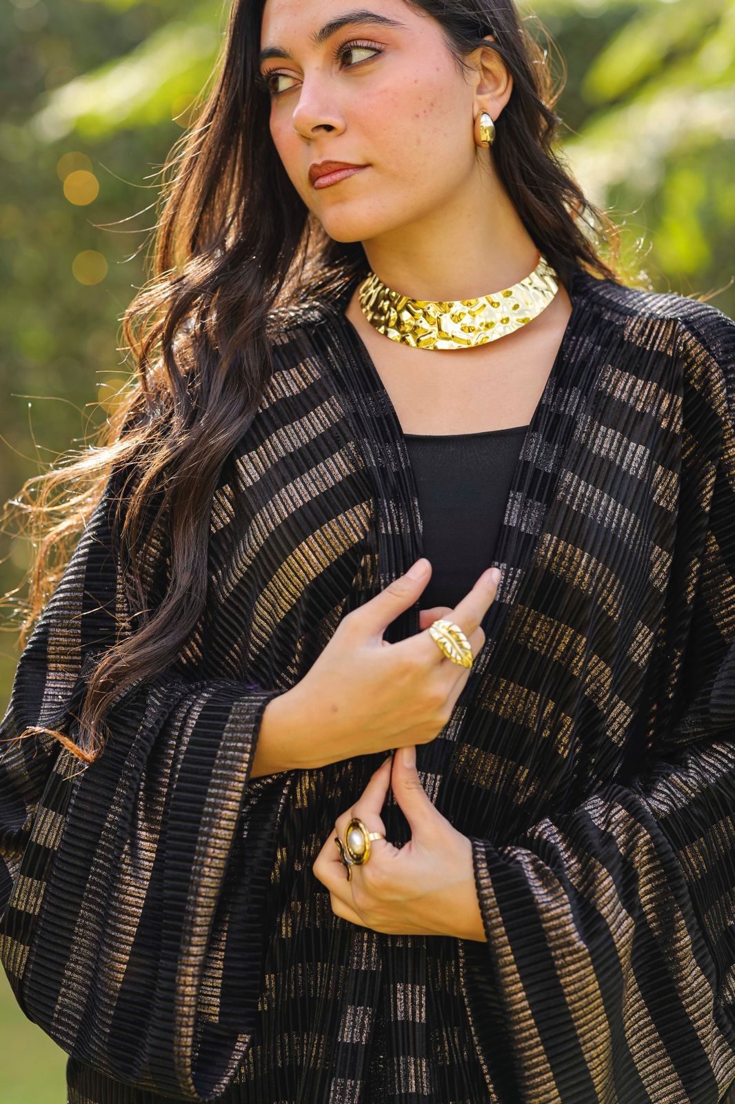 A sophisticated velvet qoftan in deep black tones, highlighted with subtle metallic stripe detailing that...