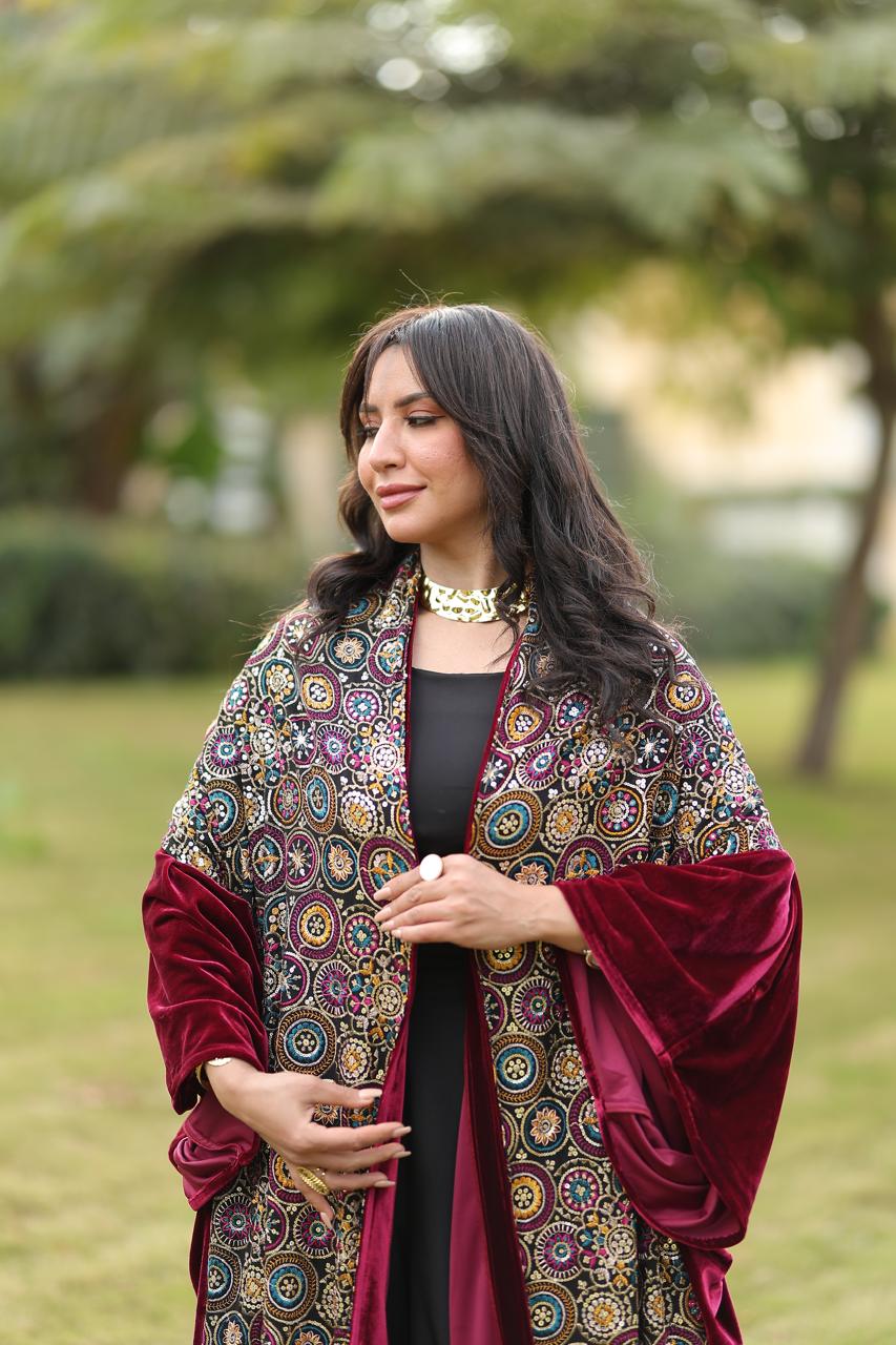 An elegant velvet qoftan in deep crimson and classic black, enriched with intricate patterned detailing...